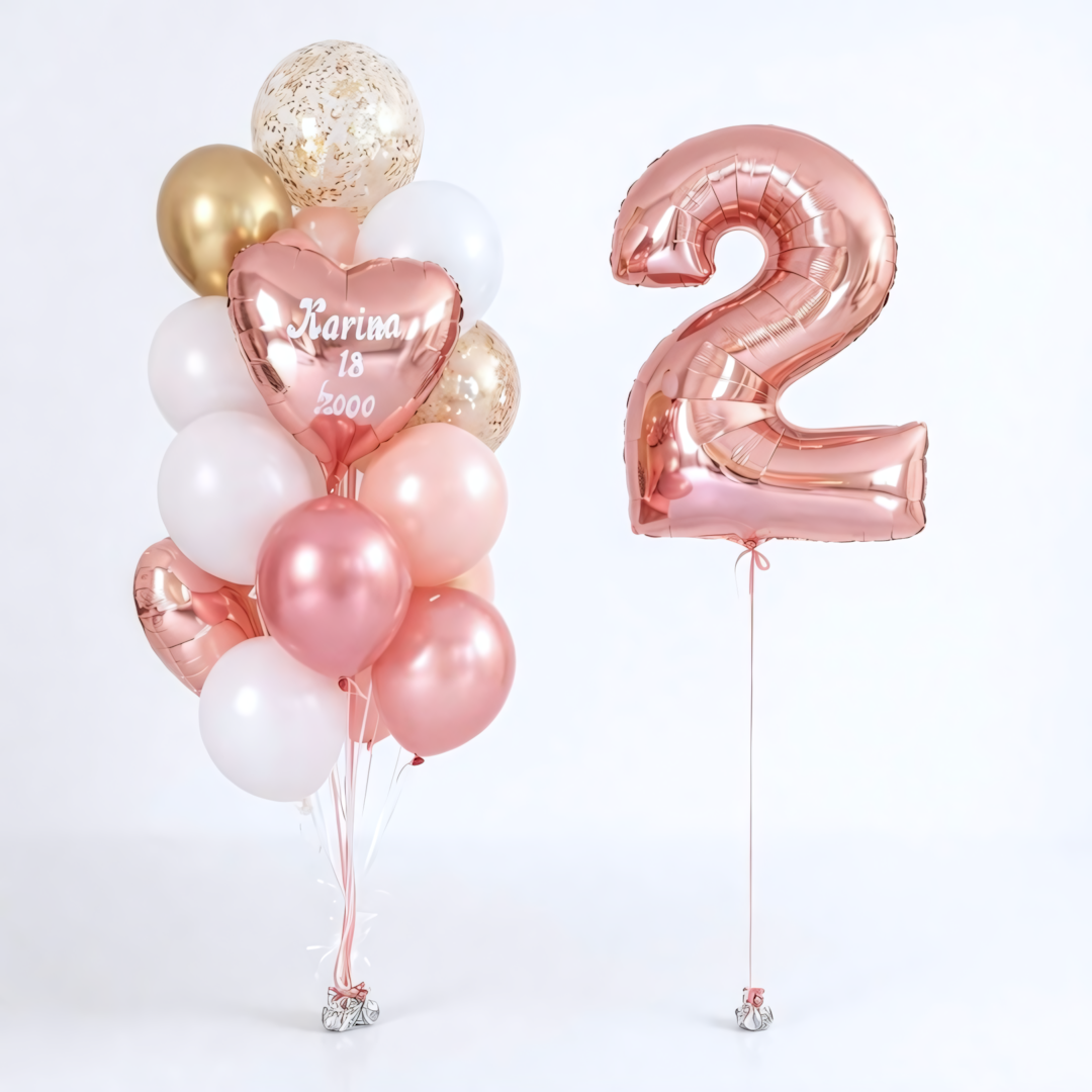 Связка из: 2 сердца розовое золото (одно с персональной надписью) 5 белых 5 розовое золото металлик 2 с золотым конфетти 2 золотой хром грузик