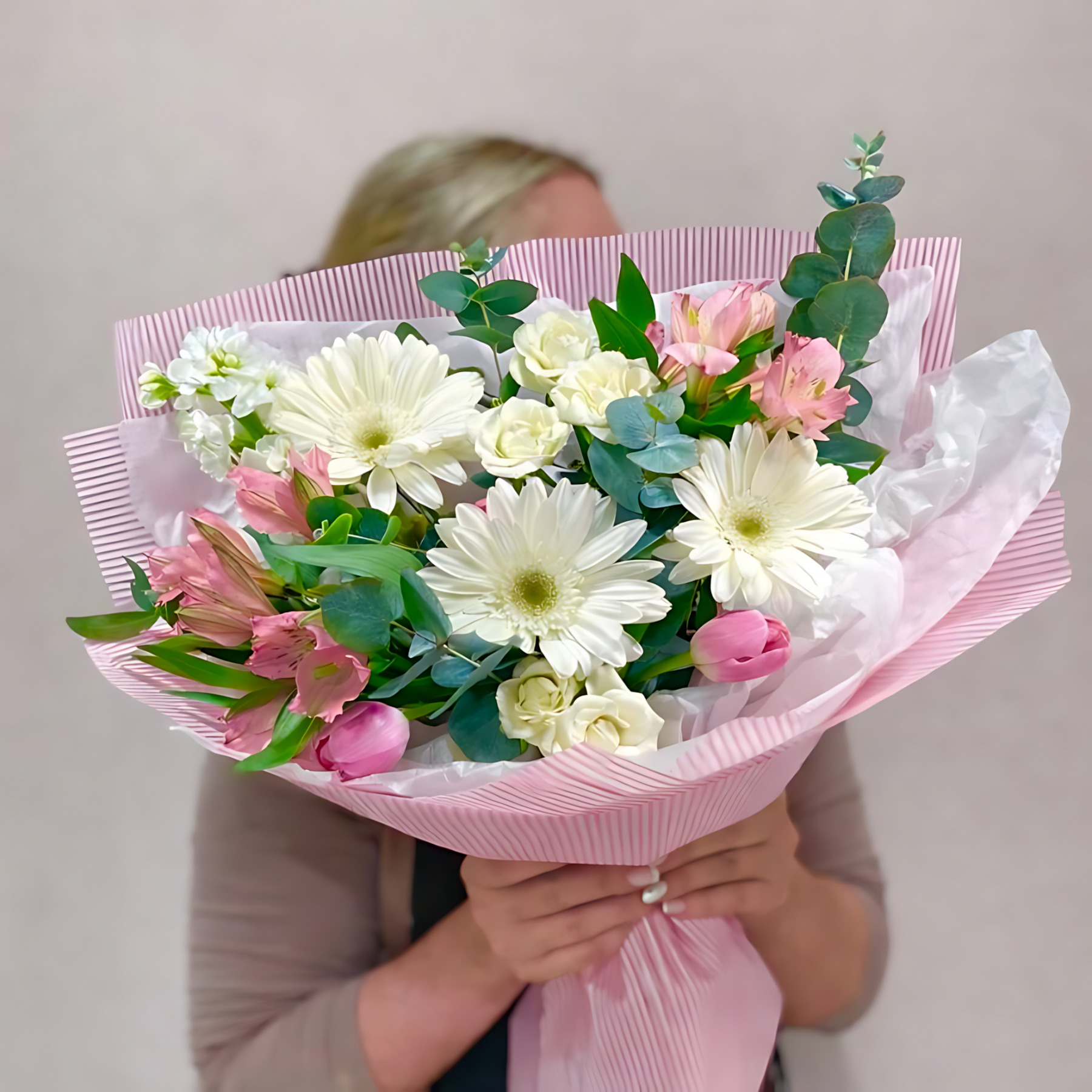 Состав: Гербера - 3 шт Тюльпан - 3 шт Роза кустовая - 2 шт Альстромерия - 2 шт Маттиола - 1 шт Эвкалипт - 3 шт Тишью - 1 шт Пленка матовая - 2 шт Лента атласная - 1 шт Размер: Высота - 50 см Ширина 33 см