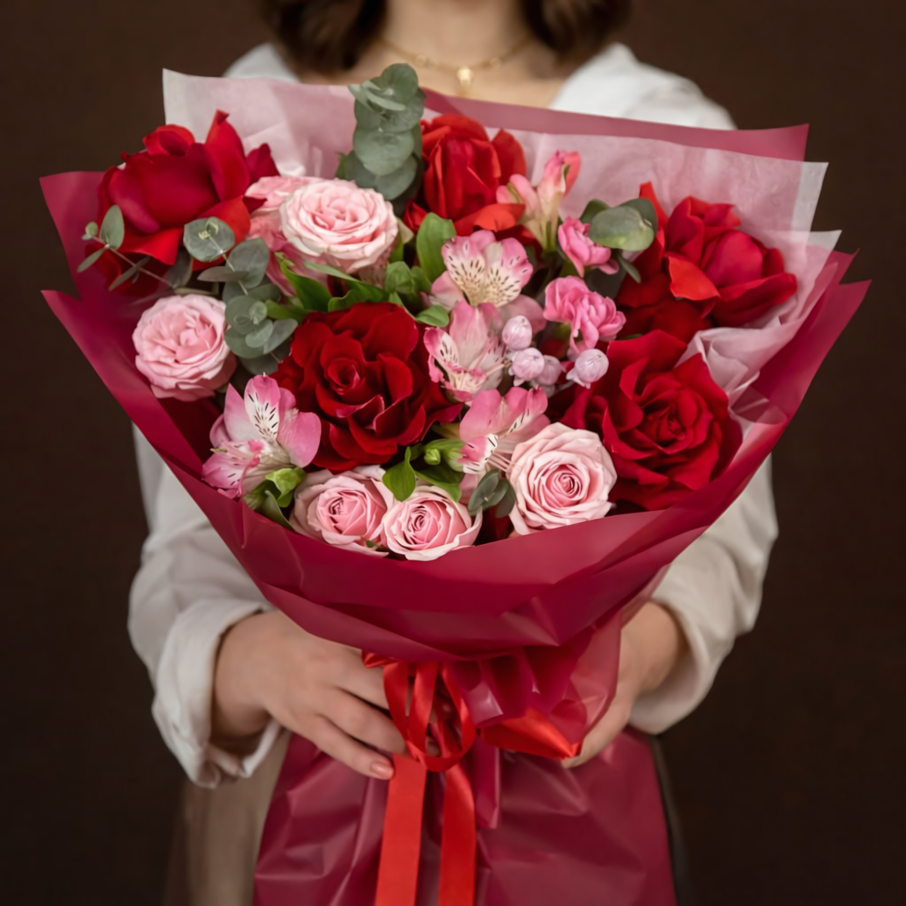Состав: Француская роза - 5шт Кустовая роза - 2 шт Гвоздика кустовая - 1 шт Гиперикум - 2 шт Альстромерия - 5 шт Эвкалпит - 2 шт Тишью - 2 шт Пленка - 2 шт Лента - 1 шт