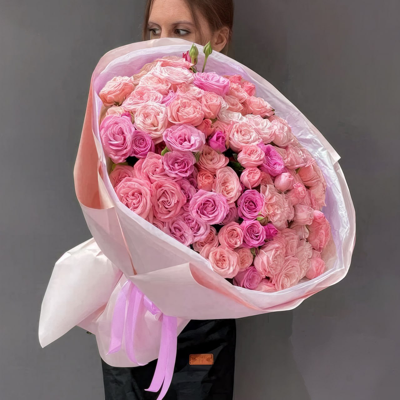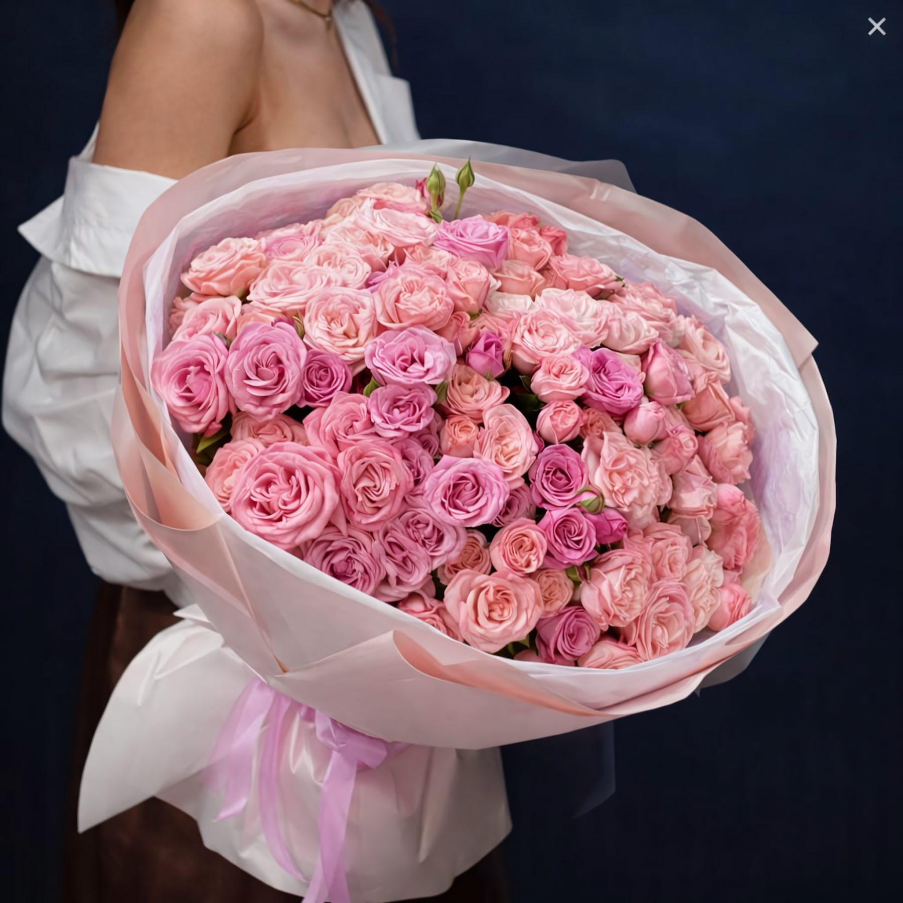 Кустовая роза - 21 шт Матовая пленка - 2 шт Тишью - 4 шт Лента - 1 шт Размер: Выоста - 50 см Ширина - 37 см