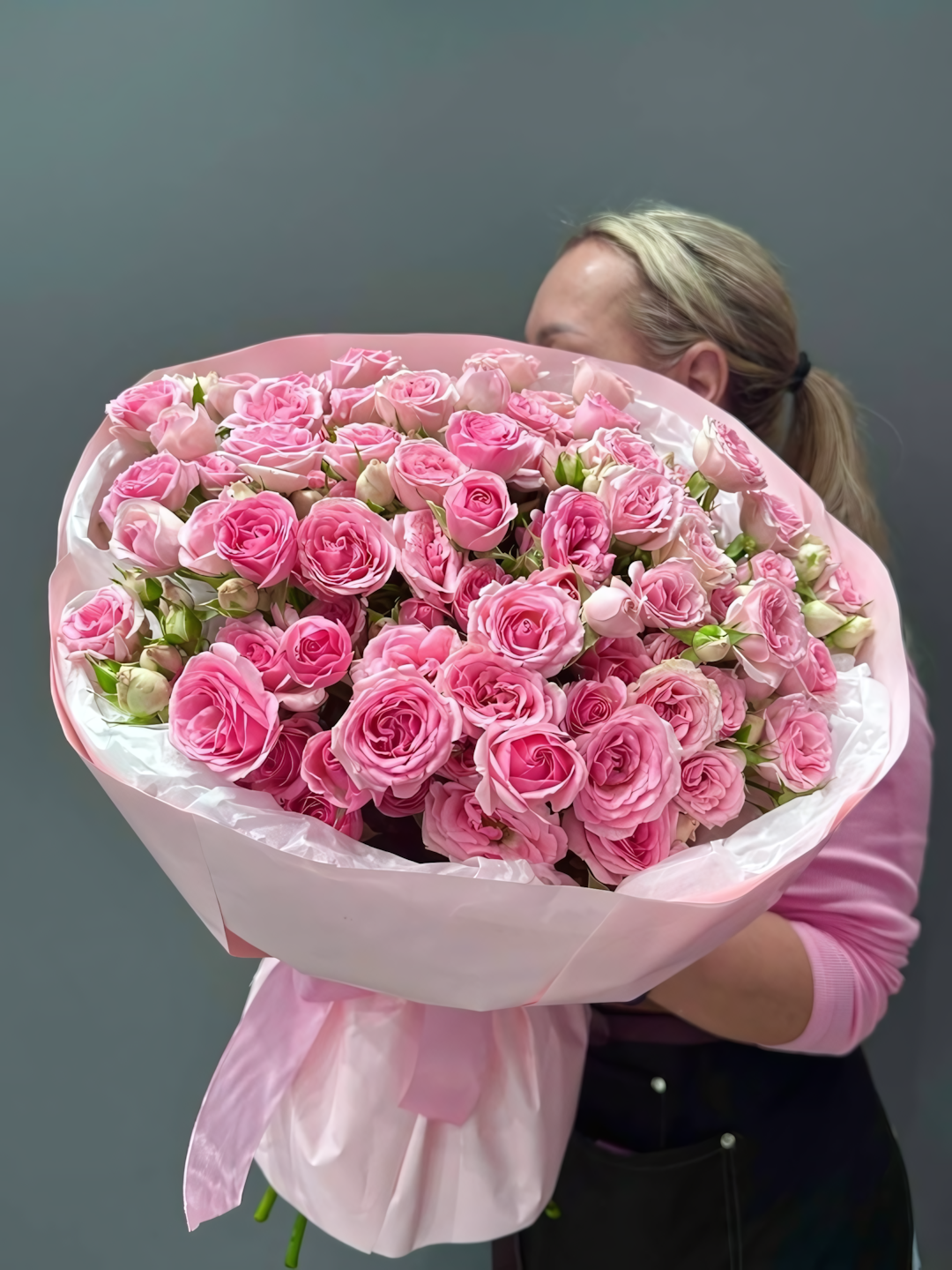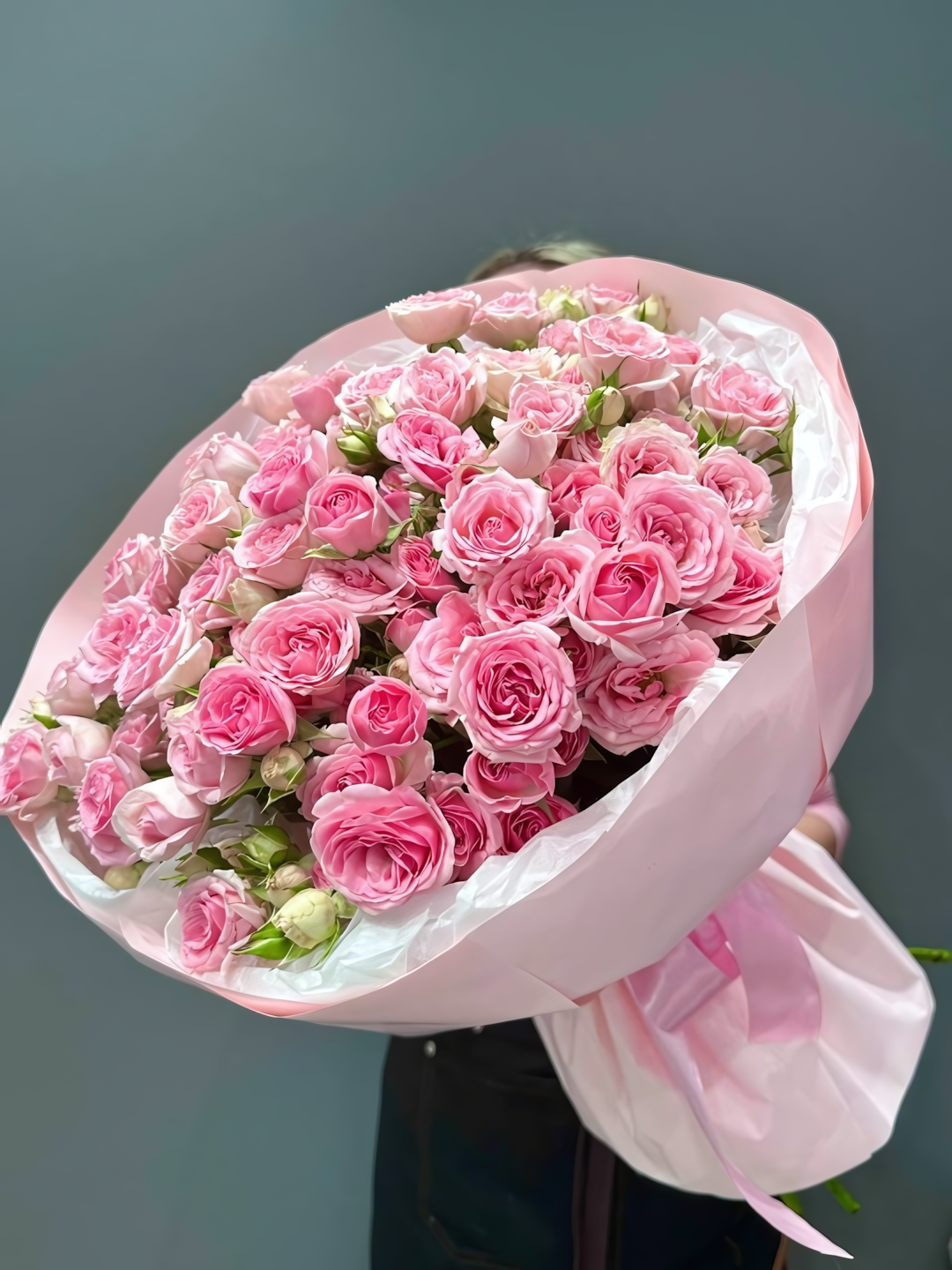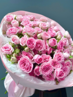 Состав: Кустовая роза - 19 шт Матовая пленка - 2 шт Тишью - 4 шт Лента - 1 шт Размер: Высота - 50 см Ширина - 35 см