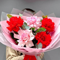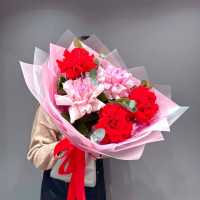 Французские розы - 5 шт Эвкалипт - 3 шт Упаковка - 3 шт Лента атл. - 1 шт Размер: Высота - 50 см Ширина - 35 см