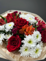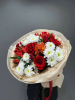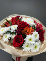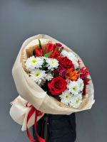 Альстромерия - 3 шт. Кустовая хризантема - 3 шт. Лента атласная - 1 шт. Тишью - 3 шт. Гвоздика кустовая - 3 шт. Пленка матовая - 1 шт. роза 60 см красная - 3 шт.