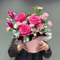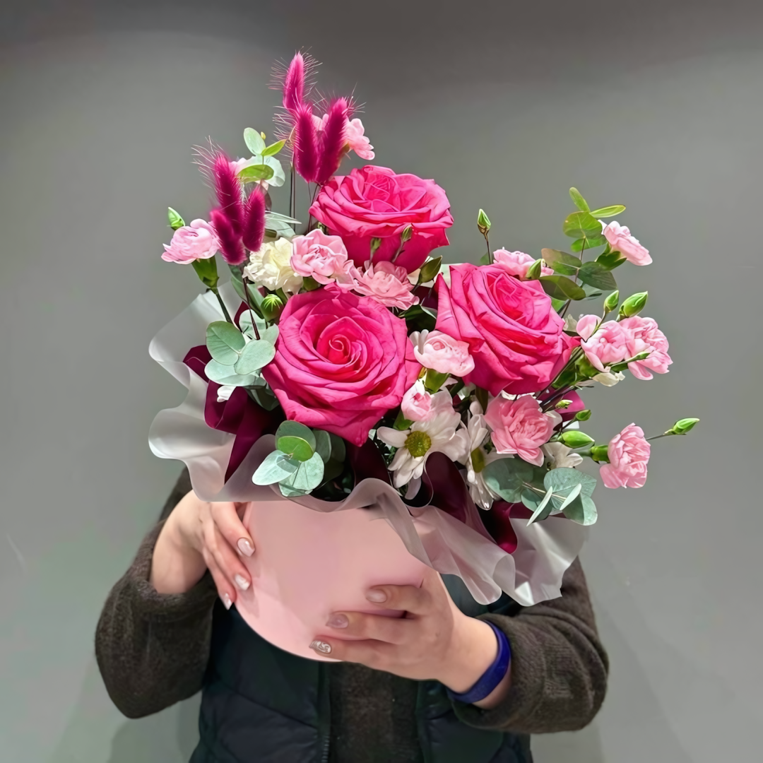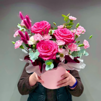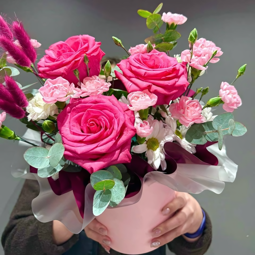 Хризантема кустовая - 1 шт. Эвкалипт - 2 шт. Коробка шляпная - 1 шт. Гвоздика кустовая - 4 шт. Оазис - 2 шт. Лагурус - 6 шт. Пленка матовая - 1 шт. роза микс - 3 шт. гвоздика микс - 2 шт. Размер Ширина - 30 см Высота - 30 см