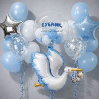 В Комплект входит Прозрачный шар с надписью и шариками Фигура фольгированная аист 2 звезды фольгированные 6шт голубых 4шт белых 2 с конфетти 4 грузика