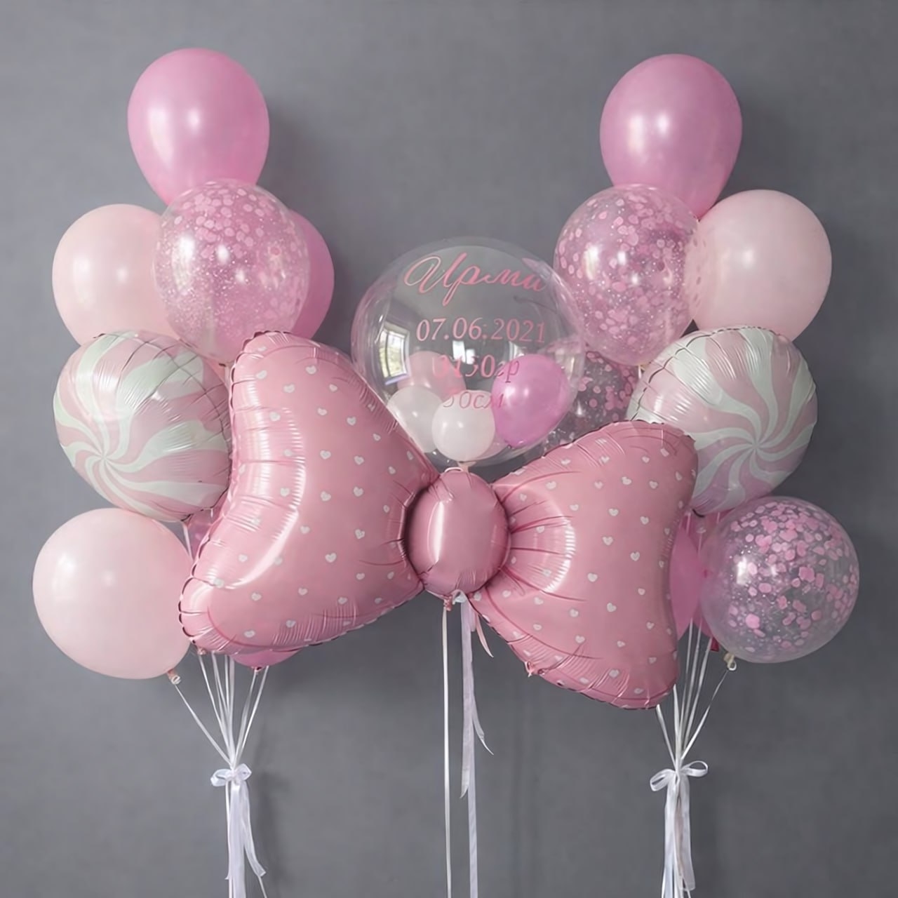 В Комплект входит: Прозрачный шар с шариками и надписью Фольгированная фигура бант 2 фольгированных круга 10шт розовых 4шт с конфетти 3 грузика