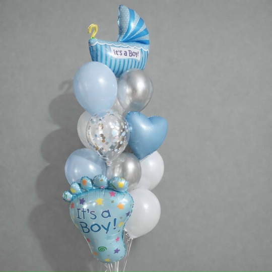 В Комплект входит: Фигура фольгированная коляска Фигура фольгированная ножка Сердце фольгированное голубое 3шт. серебро металлик 2шт. прозрачных с конфетти 2шт. белых 2шт. голубых 1 грузик Комплект может быть выполнен в розовых тоннах для девочки.