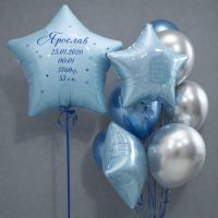 В Комплект входит: 1 Звезда большая фольгированная с персональной надписью 2 фольгированные звезды 3 шт. хром синих 3 шт. хром серебро 2 грузика Комплект может быть выполнен в другом цвете для девочки.