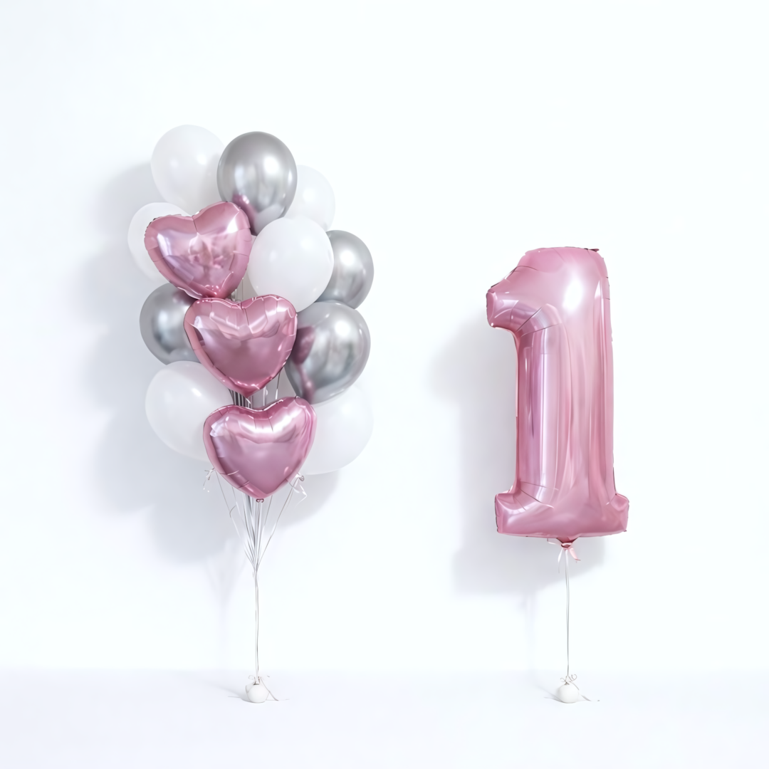 В Комплект входит Цифра любого номинала 3шт сердца розовых 5шт серебро хром 9шт белых 2 грузика
