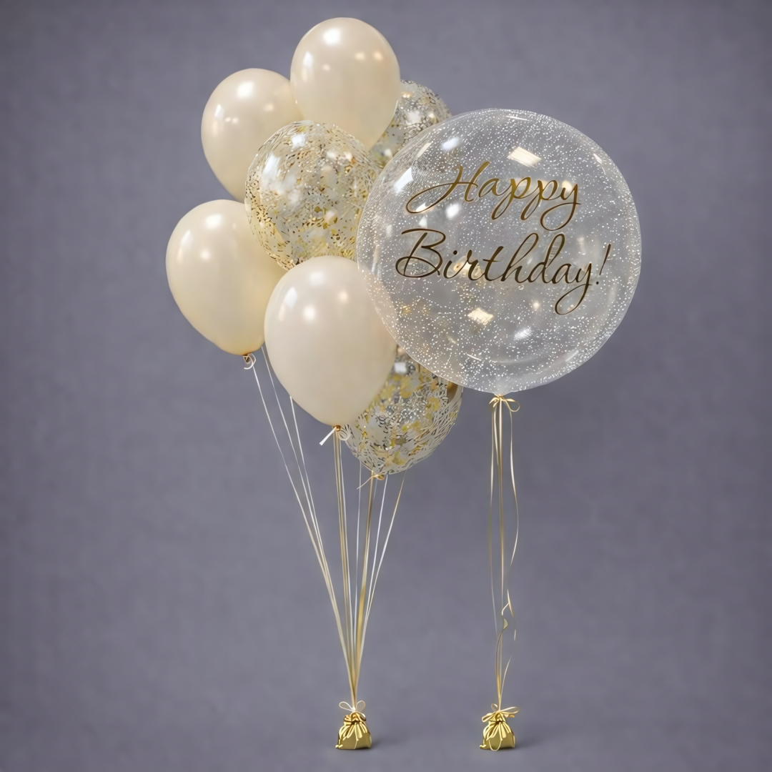 В Комплект входит: Прозрачный шар с индивидуальной надписью 3шт бежевых 2шт белых 2шт прозрачных с конфетти 2 грузика