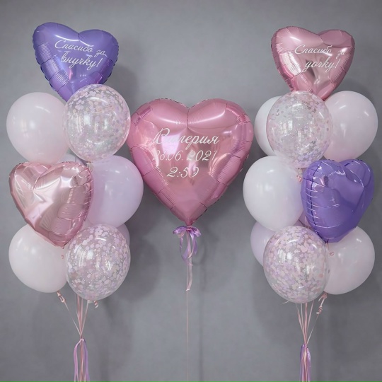 В комплект входит : Большое сердце с надписью 4 фольгированных сердца ( 2 с надписью) 4шт белых 4шт розовых 4шт лаванда 4шт с конфетти 3 грузика