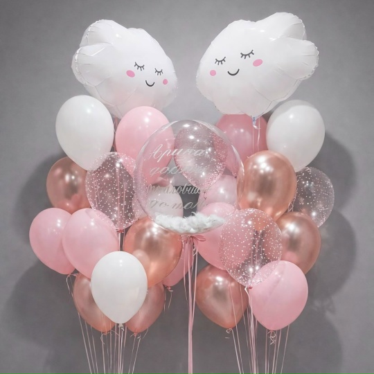 В Комплект входит: Прозрачный шар с перышками и индивидуальной надписью 2 облачка 8шт розовых 6шт розовое золото металлик 6шт белых 4шт с конфетти 3 грузика
