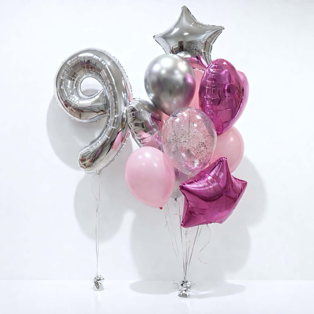 В Комплект входит: Цифра любого номинала 0-9 4шт фольгированных шаров (звзда/сердце) 2шт серебро хром 2шт прозрачных с конфетти 3шт розовых 2 грузика