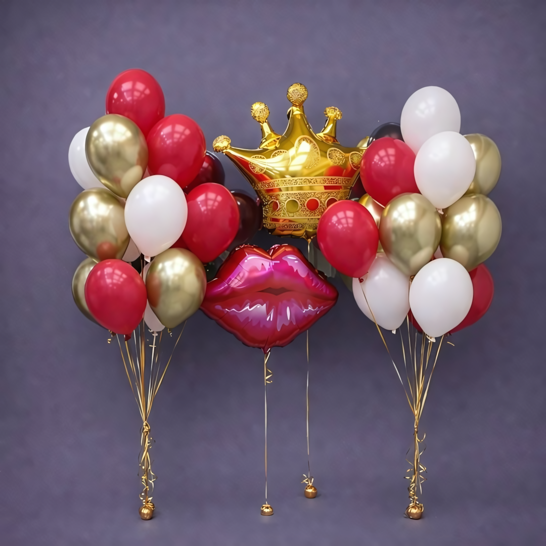 В комплект входит: Корона фольгированная фигура Губы фольгированная фигура 10шт красных 8шт хром золото 8шт белых 4 грузика